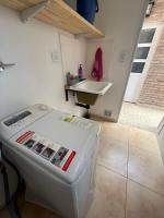 Lavadero con lavarropas automático y lugar de guardado.