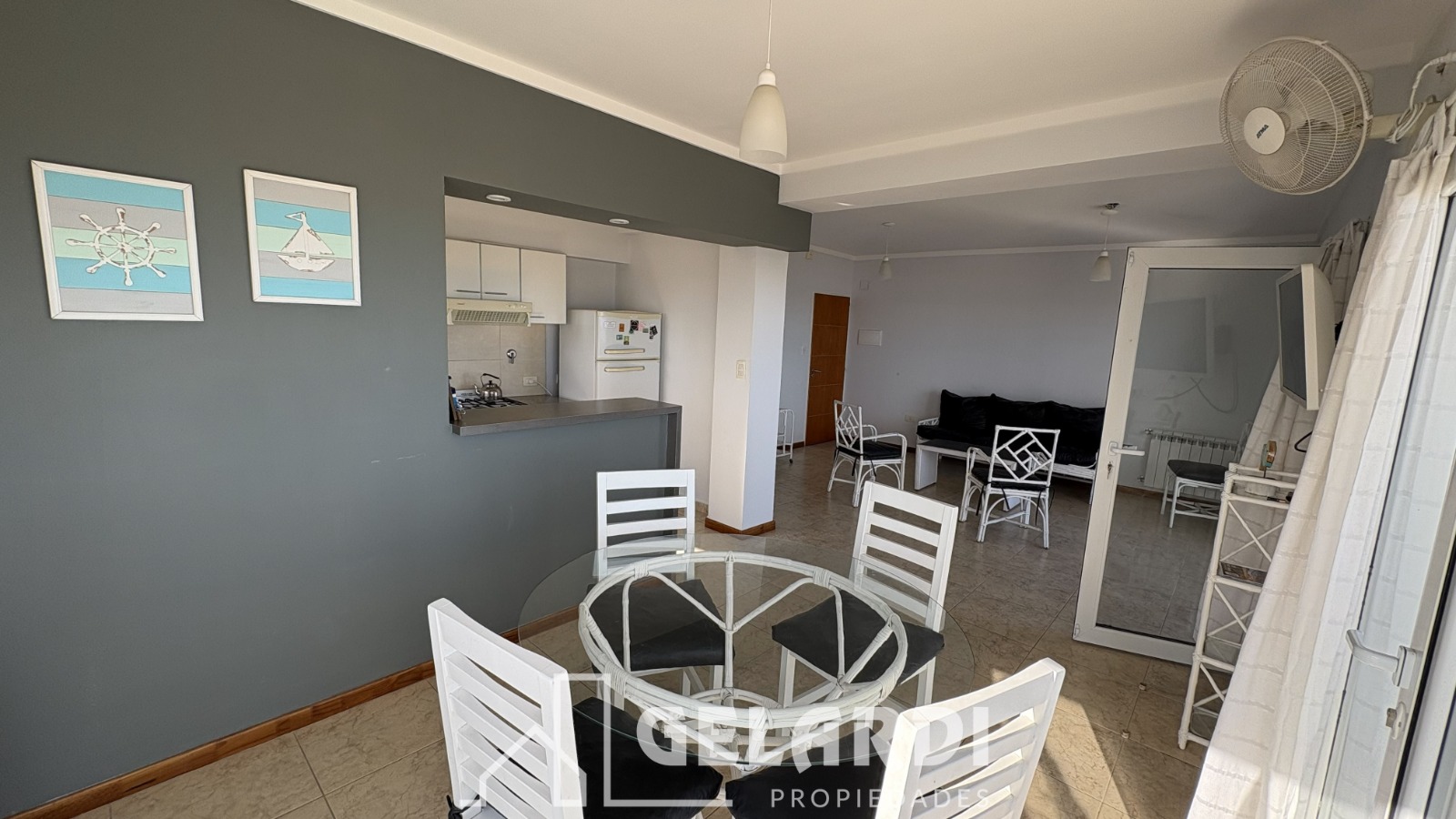 Living comedor con ventanales a un amplio balcón con parrilla, cocina integrada, dos dormitorios (uno con cama matrimonial y el otro con dos camas individuales), baño completo y ante baño.